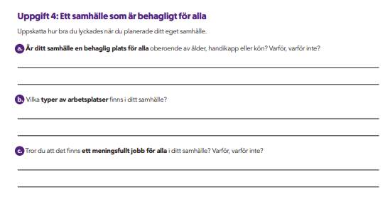 Lektionsplaner: 2:a lektionen Så fungerar vårt samhälle Granska lektionernas innehåll och mål. 2.1 Intro 2.2 Uppvärmning 2.3 Läsning av informationstexten 2.4 Uppgift 1. Företagets vinst 2.5 Uppgift 2. Företag och offentliga tjänster 2.6 Uppgift 3. Ditt eget samhälle 2.7 Uppgift 4. Ett samhälle som är behagligt för alla 2.8 Avslutning 2:a lektionen: Så fungerar vårt samhälle Uppgift 4. Ett samhälle som är behagligt för alla I uppgiften utvärderar eleven det samhälle hen har byggt upp. Uppgiften kan också göras som en diskussionsuppgift med paret. Det finns inga rätta svar på uppgiften. Tillbaka 1/1 Uppgift 4. Ett samhälle som är behagligt för alla Föregående Följande