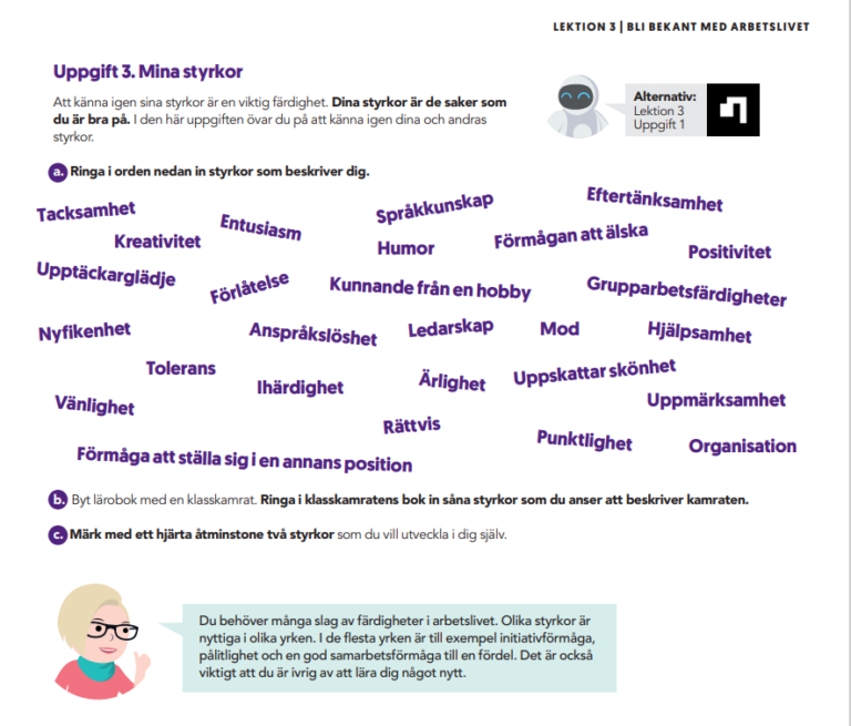 Syftet med denna uppgift är att stödja elevens självkänsla och hjälpa hen att identifiera hos sig själv de styrkor som behövs i arbetslivet. Det finns inga rätta svar på uppgiften.