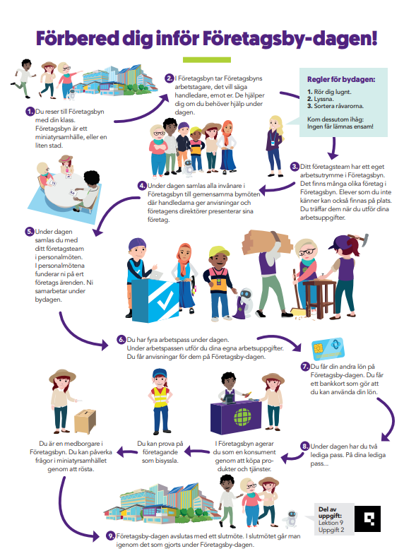 Sidan efter lektionen kan användas för gemensam förberedelse i skolan, som tidsfördriv under resan till Företagsbyns lärandemiljö eller som hemläxa. Syftet med sidan är att erbjuda lättnad till nervositeten inför dagen i Företagsbyn. Dagen är uppbyggd på ett sådant sätt att eleverna kan klara sig bra i Företagsbyn utan att behöva gå igenom sidan. Det viktigaste i Företagsbyn är ett öppet sinne för nya saker.